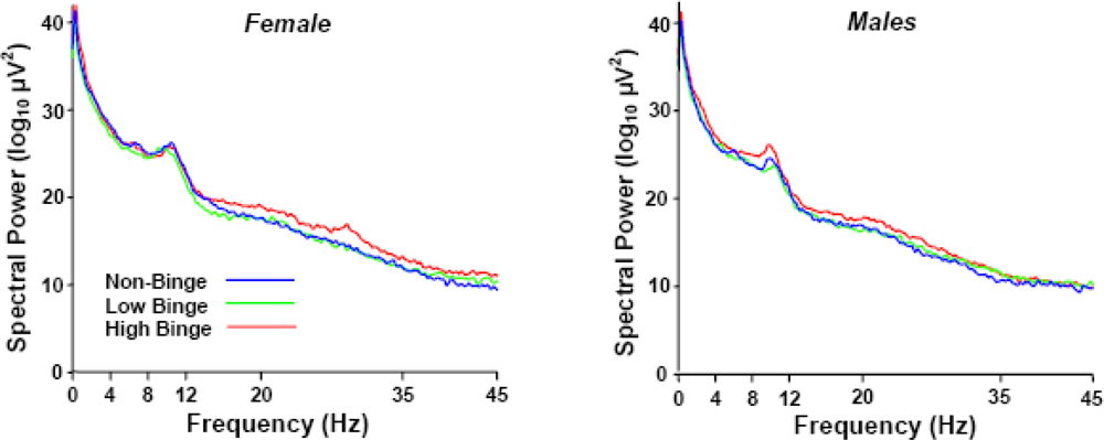 Grand average power spectra of each binge and sex group as a function of EEG.