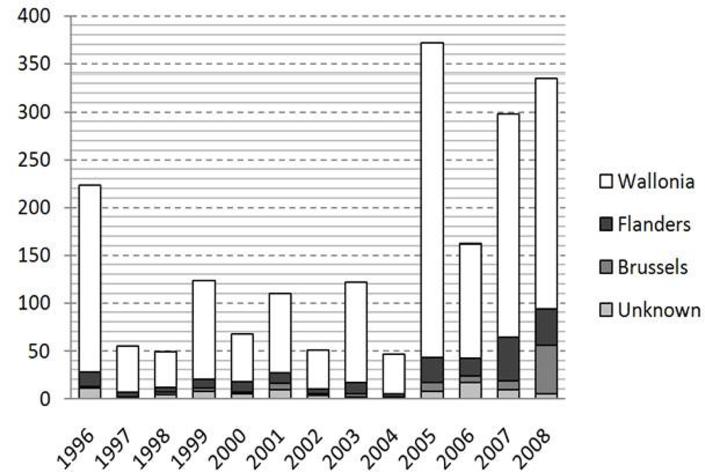Number of NE reported cases in the different Belgian regions for the period 1996–2008 [].