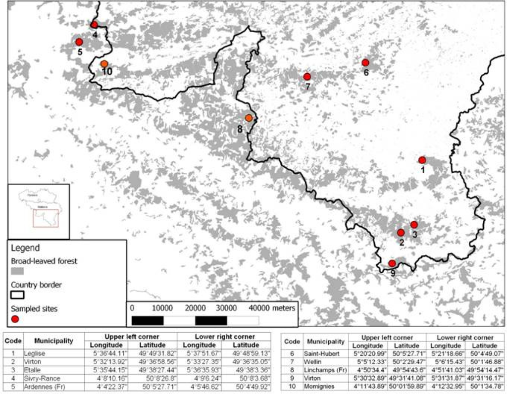Based on these observations, this study focuses on forested areas in Wallonia (southern Belgium) and two sites in France where a high NE incidence has been observed []. The exact location of our sample sites is shown in Figure 2.