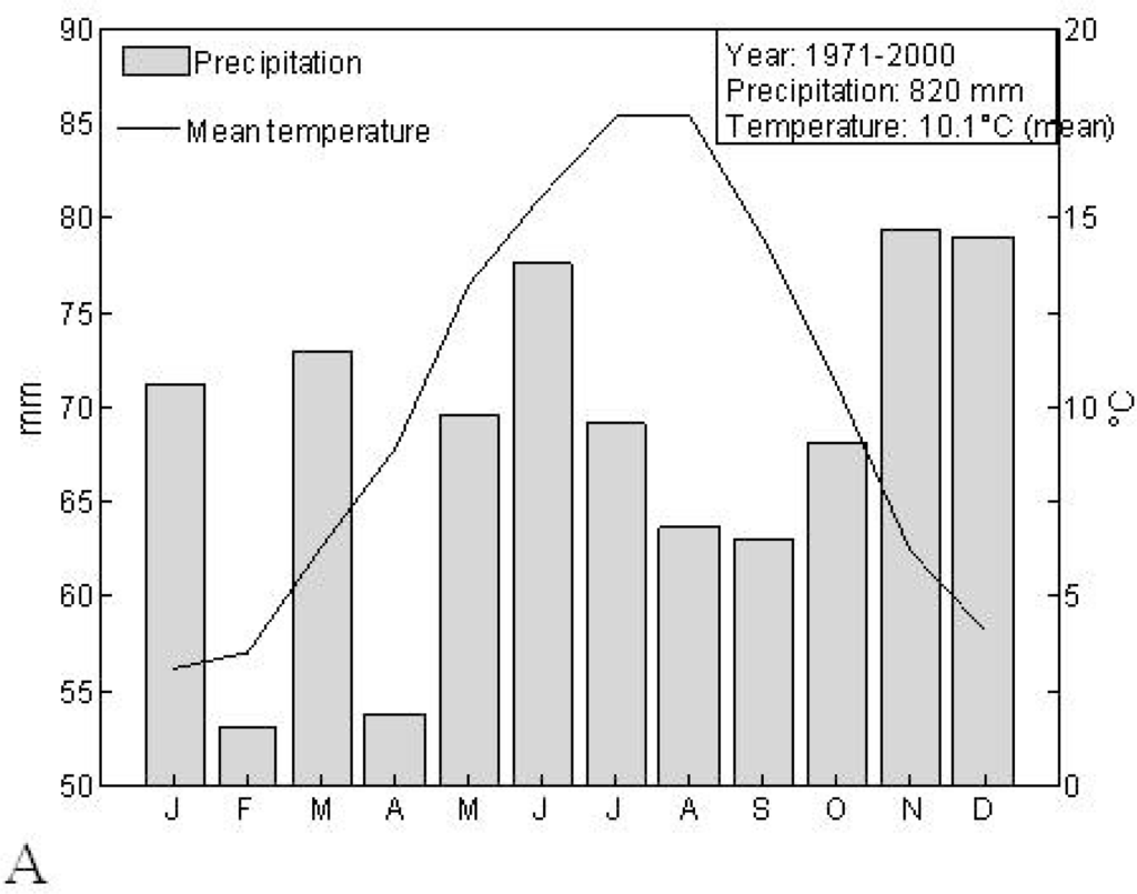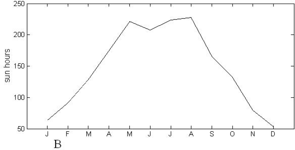 Climatogram (A) and Monthly average sun hours (B) in Belgium based on meteorological data for the period 1971–2000 [].