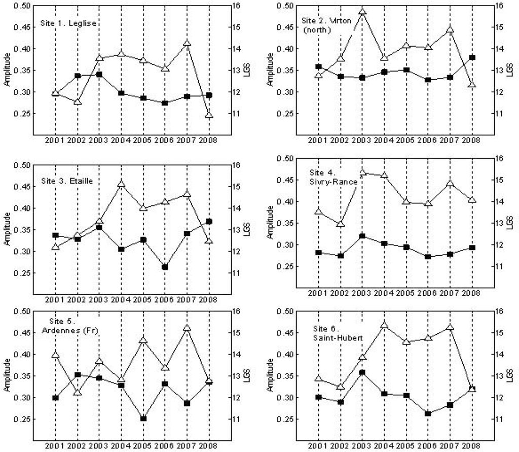 Nevertheless, a clear increasing trend in the LGS is observed and site specific conditions may explain the differences in magnitude. The satellite data of the Sivry-Rance, for instance, are strongly influenced by important agriculture areas. This explains that this and other sites showed a mild increase in LSG during the considered period. The increasing trend in LSG was more evident in highly dense forest complexes like the forests in Saint-Hubert, the French Ardennes, Leglise or Wellin.