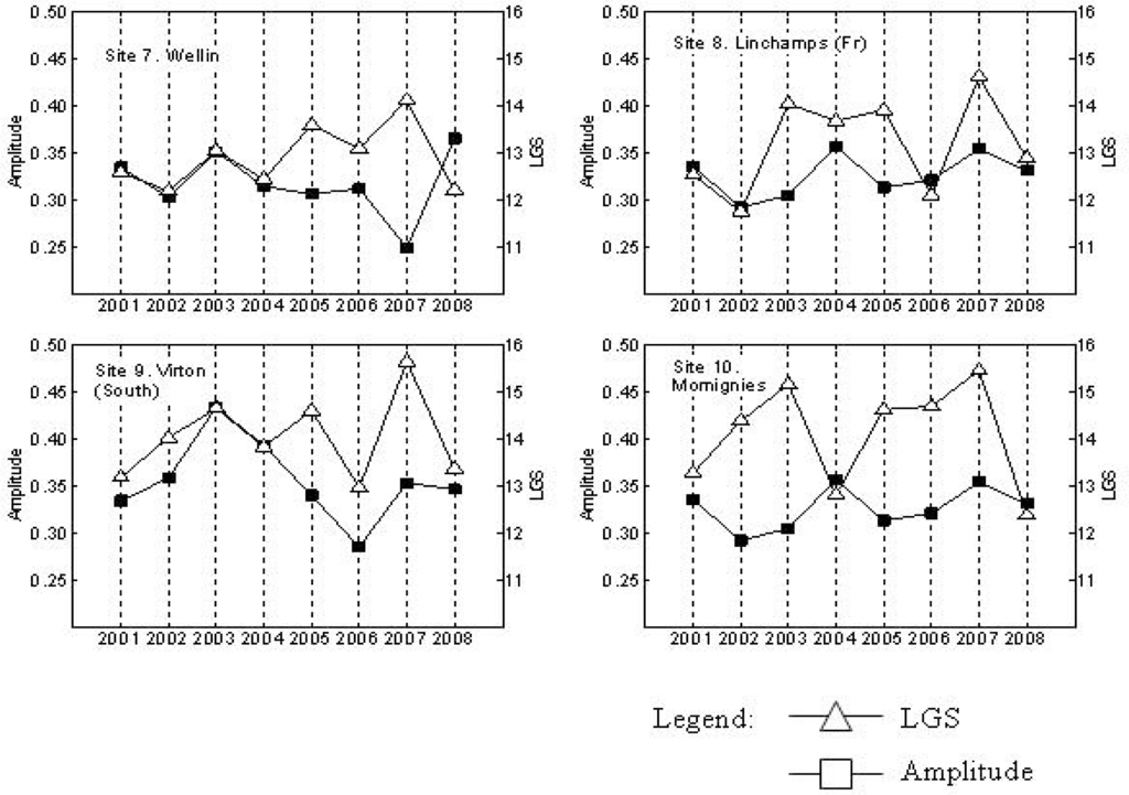 One of the most remarkable observed phenomena was the gradual increase in LGS in the period 2001–2007. Fitting these values to a linear function produced positive slope values for all sites, as can be seen in Table 1. The hypothesis that the slope value was statistically equal to zero was tested and, due to the difference in slope steepness and reduced number of years in the analysis, the hypothesis could not everywhere be rejected at a significance level of 0.05.