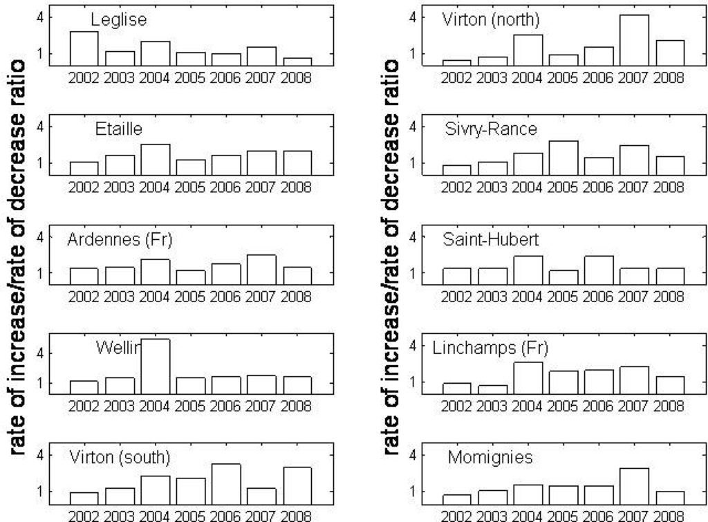 Annual rate of increase/rate of decrease ratio for the period 2002–2008 for 10 BLF sites in Belgium and France.