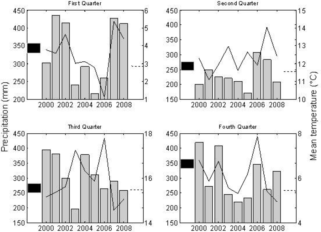 Average temperature (°C) (continuous line) and precipitation (gray bars) per quarter in the period 2000–2008 in the meteorological stations Forges (Chimay). Averages were estimated from records for the period 1980–2008: Mean temperature is the interrupted line; mean precipitation is the black bar.
