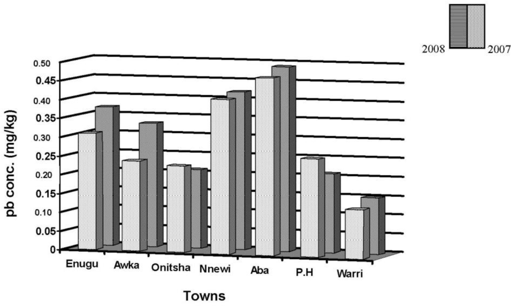 Appreciable quantities of lead levels were determined in all the samples, with soil samples having the highest values. Onitsha, Aba, Nnewi and Port Harcourt soils had the highest lead content for both years. Highest values of 120.00 ± 0.00 mg/kg and 80.36 ± 0.00 mg/kg of lead were reported in Onitsha for 2007 and 2008. Nnewi (33.40 ± 0.01 and 4,238.29 ± 0.00 smg/kg) for 2007 and 2008. Aba (22.56 ± 0.01 and 21.28 ± 0.00 smg/kg) for 2007 and 2008. Higher concentrations were recorded for Nnewi and Port Harcourt in 2008 than in 2007, while Enugu had more in 2008 than in 2007, though the roads vary. The lead levels for each point (point of collection) on each road of all the cities vary, and the levels of Warri were smaller, followed by Awka and Port-Harcourt, respectively, in 2007, while in 2008, the levels of Warri were low and followed by those from Enugu (Tables 1 and 2).