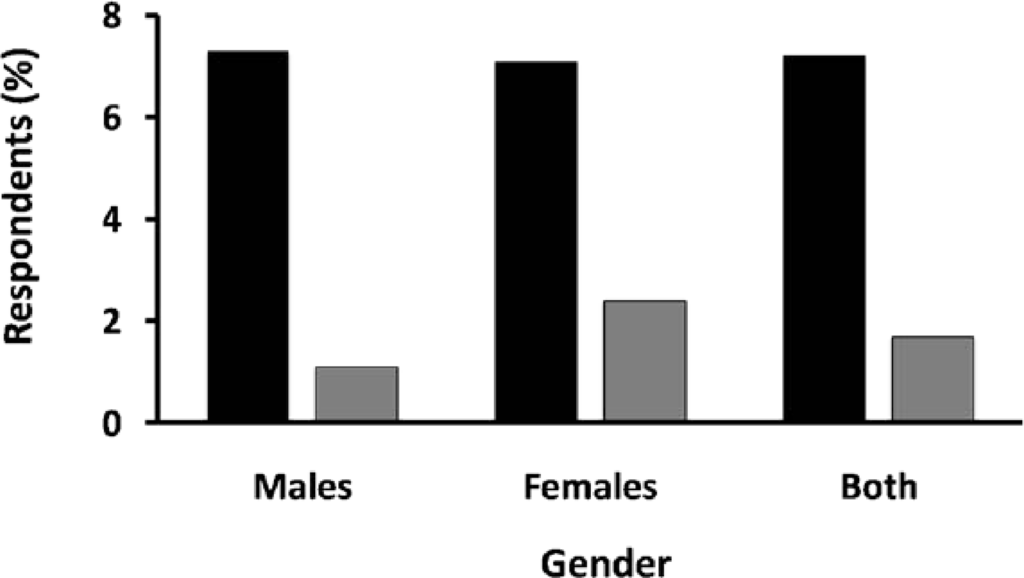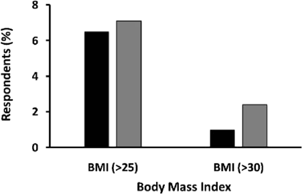 2007 Prevalence of Overweight and Obesity in Nepal. Data are based on a nationally representative sample for males and females with body-mass index (BMI) 25–30 (black bars) and BMI > 30 (grey bars). Data derived from the 2007 Nepal Non-Communicable Diseases Risk Factor Survey [28].