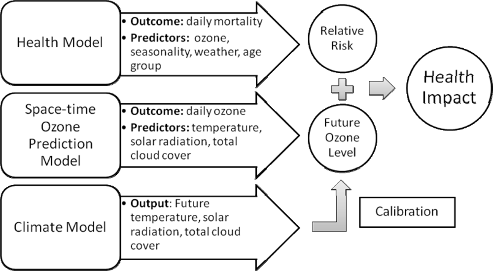 A modeling framework integrating climate model outputs, meteorological observations, and health data to quantify the health impacts of future ozone level.