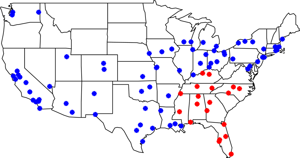 Locations of all NMMAPS communities (blue) used in the health model and the subset within the Southeastern U.S. study region (red).