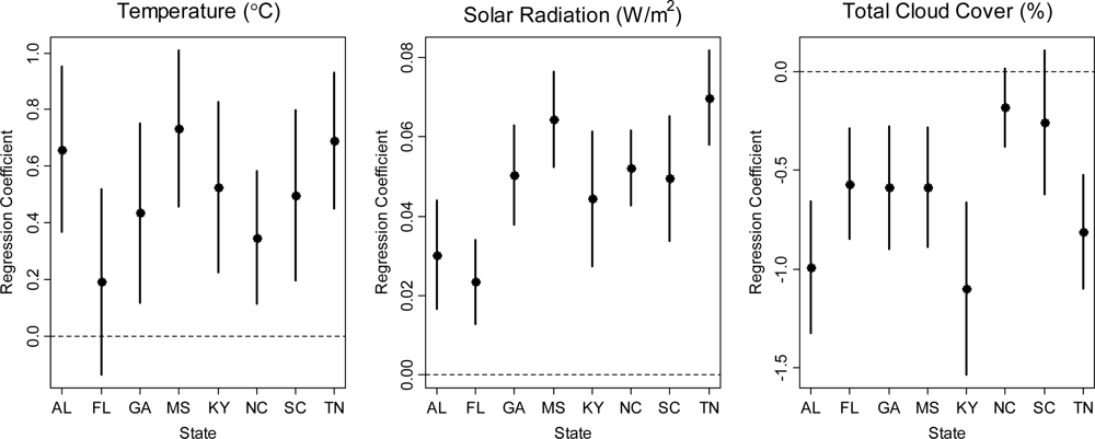 Figure 3 give the parameter estimates and 95% posterior intervals (PI) for the model of daily maximum 8-hour ozone concentration in 2000 as described in Section 2.1. We found that ozone concentration was positively associated with temperature and solar radiation, but negatively associated with total cloud cover. There is also evidence the association between weather variables and ozone level can vary across states. Across 111 monitors, the summer average level of ozone concentration, temperature, solar radiation (GHI), and total cloud-cover was 53.3 ppb, 24.2 °C, 240 W/m2, 4.42%, respectively. Therefore total cloud-cover explained considerably less variation in ozone concentration compared to temperature and solar radiation.