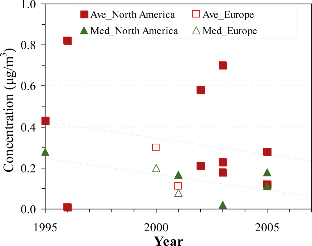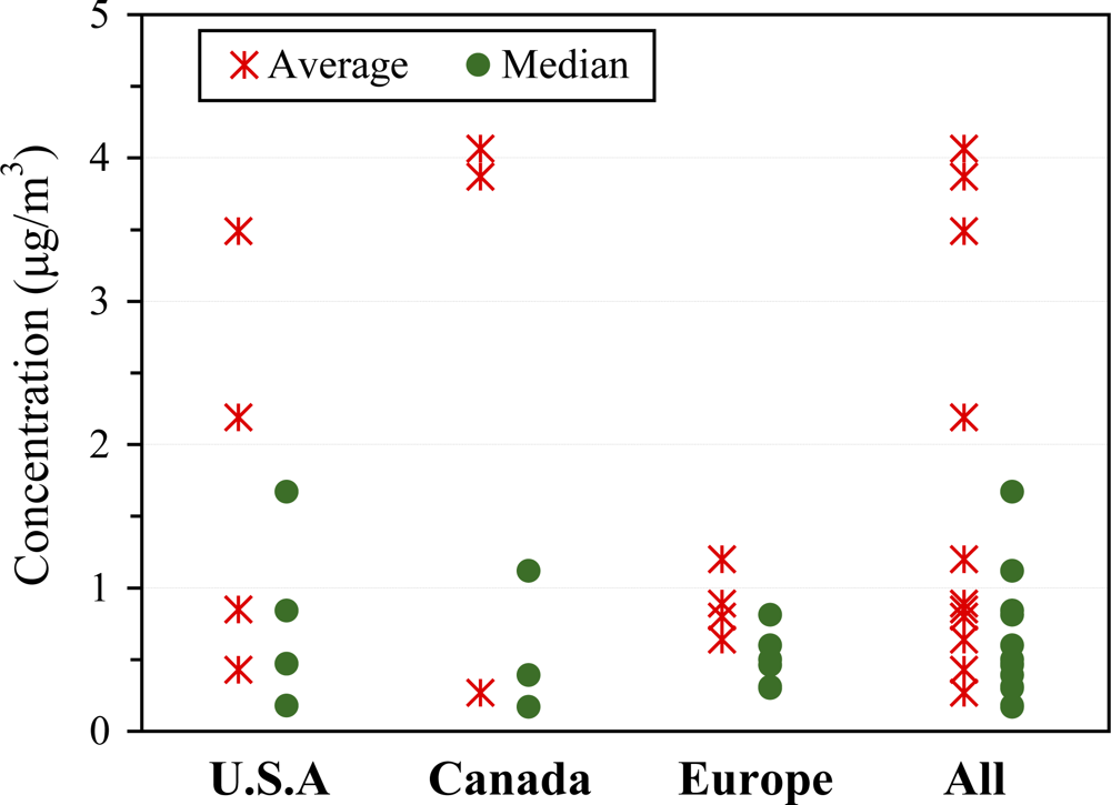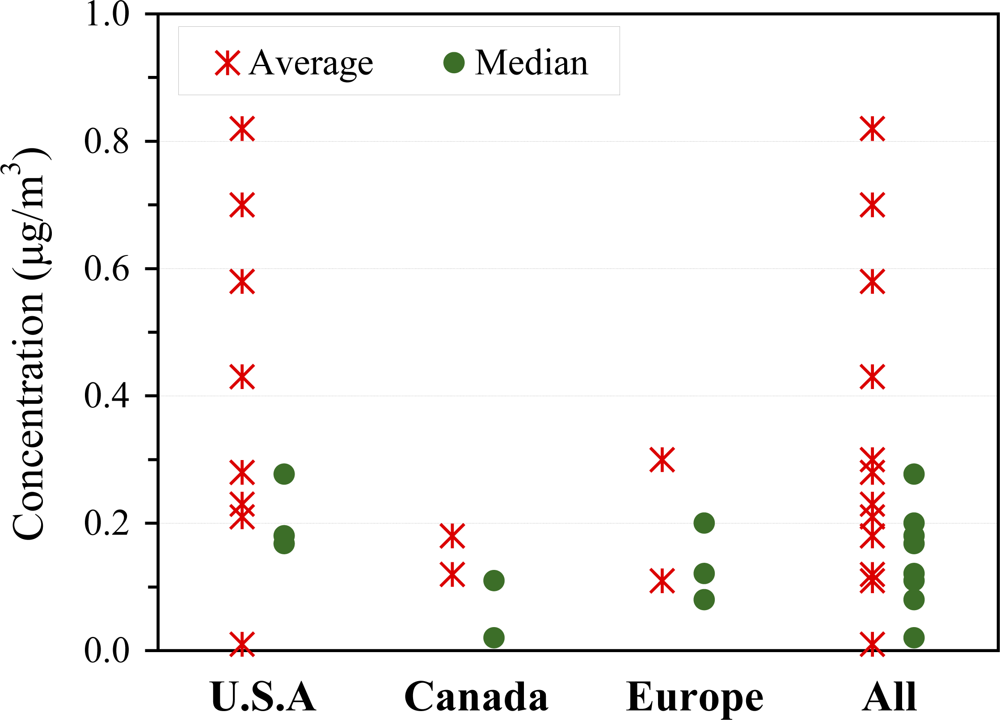 Pollutant measurements can be influenced by many factors, e.g., community type (industrial, urban, suburban, rural and remote areas), season, and the presence of smoking. We derived representative ranges of average and median concentrations (minimum to maximum reported across the studies) by targeting non-smoking populations in urban areas; this was also the typical study design. Four measurement types were excluded in deriving representative concentration ranges: (1) concentrations collected in smoking residences, if explicitly stated and reported separately; (2) concentrations measured in rural and remote areas that are commonly treated as “background” levels; (3) “old” data, that is, samples collected before around 1990. Data prior to 1990 has been previously reviewed (as reported in Section 3.2.1), and sometimes showed high concentrations; and (4) data with known or suspected measurement bias, e.g., small sample size, and unreasonably high concentrations.