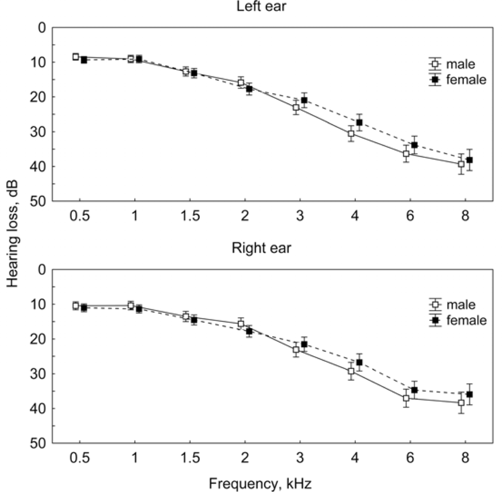 Of all 531 tinnitus patients tested, 441 (83%; 220 men and 221 women) had a hearing loss in the upper frequencies (Figure 1), corresponding to a pattern found in the NIHL [13]. There were no significant differences in the hearing loss between the left and the right ear and between male and female patients in this group. Of remaining 90 patients, 84 had pantonal hearing loss and six persons heard normally. The mean age of tinnitus patients with NIHL-like audiogram was 50 years (SD = 13, min 16, max 79), with patients most frequently ranging between 40–60 years of age.
