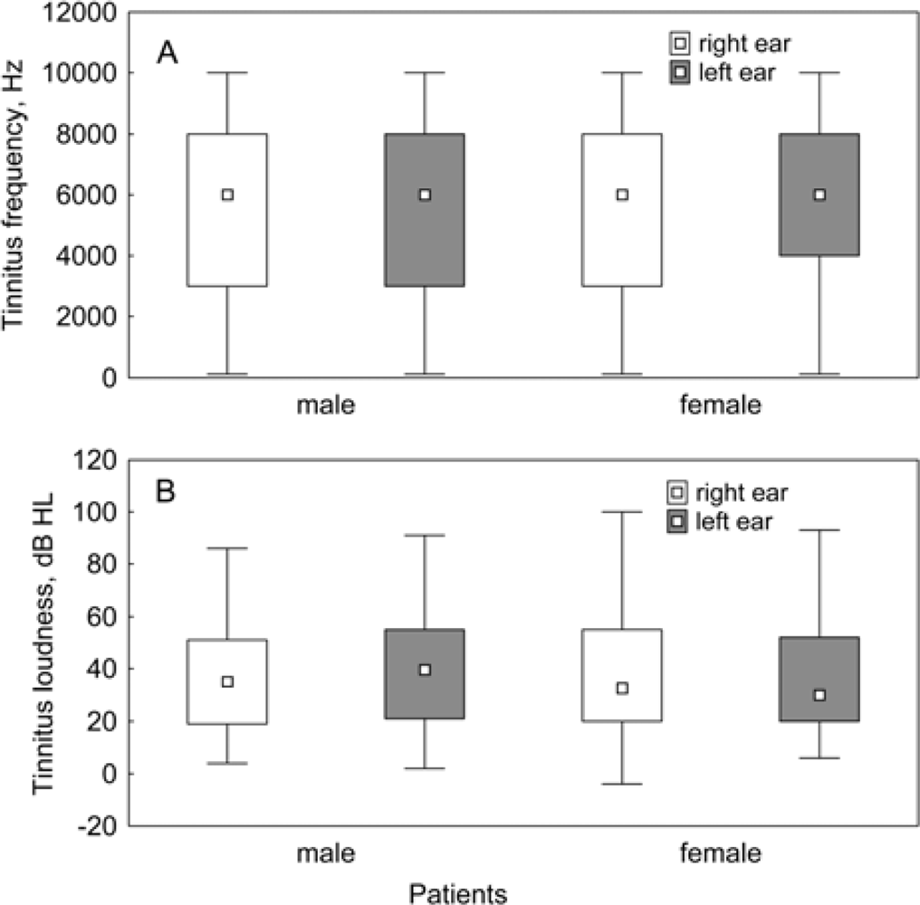 Tinnitus frequency (A) and tinnitus loudness (B) measured in the right and left ear of the male and female tinnitus patients with hearing loss. Given are the medians, percentiles (25–75%) and min-max values.