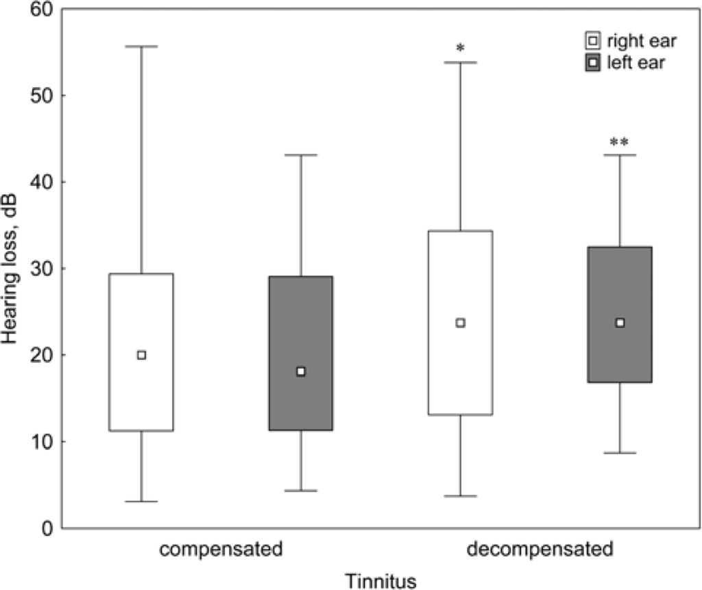 Hearing loss measured in the right and left ears of patients with compensated and decompensated tinnitus. Given are the medians, percentiles (25–75%) and min-max vales. *p < 0.05 and **p < 0.01 vs. compensated tinnitus.