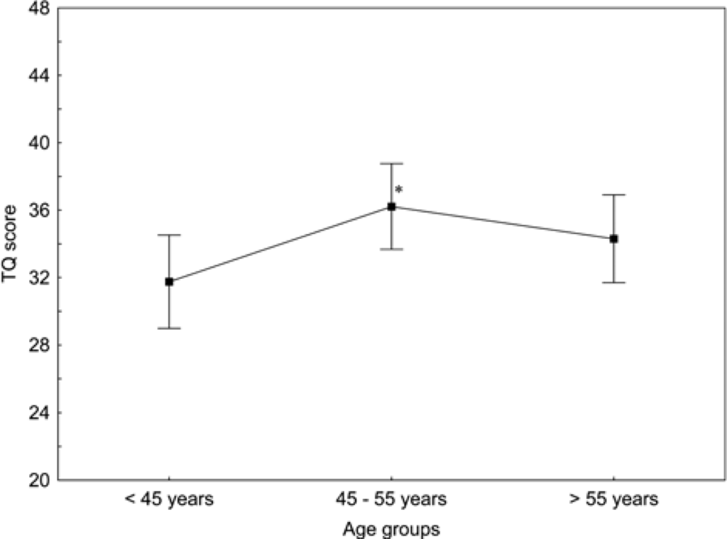 TQ scores measured in the three age groups of tinnitus patients with the hearing loss. Given are the means ± confidence intervals *p < 0.05 vs. patients < 45 years.
