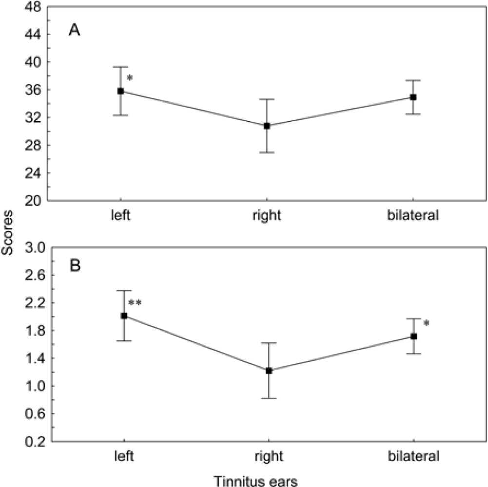 Total TQ scores (A) and scores of the subscale “somatic complaints” (B) measured in patients with left-side, right-side or bilateral tinnitus. Given are the means ± confidence intervals. *p < 0.05 and **p < 0.01 vs. right-side tinnitus.
