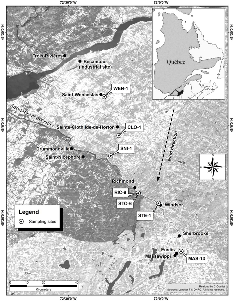 To identify the source of the contamination in alluvial soils (riparian zone) and agricultural areas (woodlots), field work was done between 2002 to 2008 [12,15,16]. For this study, four areas were selected (RIC-9, STO-6, STE-1 and MAS-13) along the riverbanks between the municipalities of Drummondville and Eustis (the Richmond, Windsor and Massawippi sites), and three other areas (WEN-1, CLO-1, SNI-1) located in an agricultural zone (Figure 1). These last three areas follow a southeasterly direction between the Bécancour industrial site and the town of Richmond, at a distance of 30–60 km (Figure 1), and are subject to north and northeasterly winds [28], which likely transport air pollutants over longer distances. The location of all the sites was determined with a Global Positioning System (GPS) and each site was then located on the mapping medium using the ArcGIS software program (versions 8.2 and 9.0).