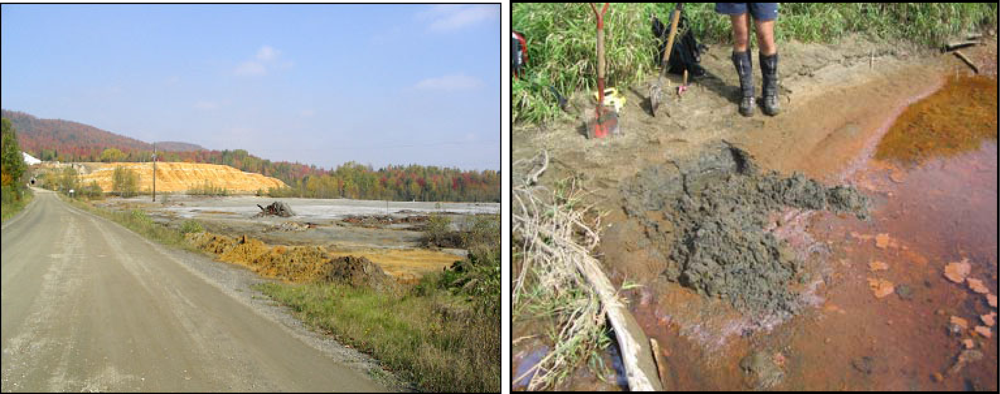 Figure 2. (a) View from the landfill of the former Eustis mine. The site serves as a pulp and paper waste disposal and storage site. (b) High concentrations of residual iron and other tailings on a riverbank of Massawippi River near Eustis mine, Southern Québec (Photos by D. Saint-Laurent, 2005).(a) Former Eustis mine (b) Bank (left) of Massawippi River
