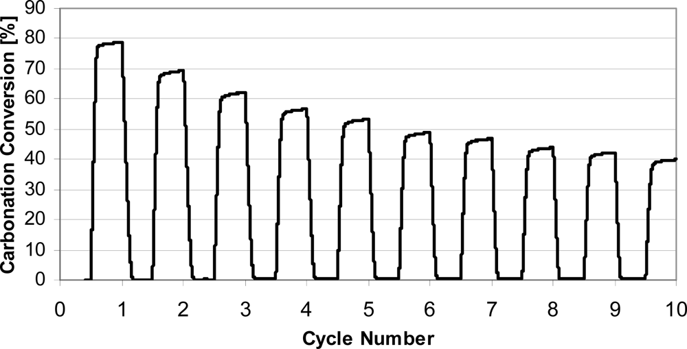 A typical TGA multi-cycle run with natural limestone is presented in Figure 2. It can be seen that after only 10 cycles, conversion dropped to 40%, half the conversion in the first cycle. The loss of activity continues, and it has been shown in long series of cycles (>1,000 cycles) that conversions become constant, at the level of 7–8% [20]. It should also be mentioned that most research has been performed under ideal experimental conditions, with calcination stages in N2 at lower temperatures, while the loss of activity occurs much faster under realistic conditions expected in real FBC systems [21,22]. It is typically supposed that during CO2 cycles, the sorbent morphology changes, and the sorbent loses surface area and small pores, which are the main contributors to the rapid carbonation necessary for practical systems.