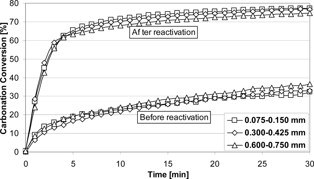 Typical results for sorbent reactivation tests are presented in Figure 3. It may be seen that spent sorbent had a carbonation degree ∼35%, regardless of particle size. After reactivation, the sorbent had higher activity and final value for the carbonation conversions in the first cycle above ∼75%, regardless of the particle size, which was significantly higher than related values for spent sorbent.