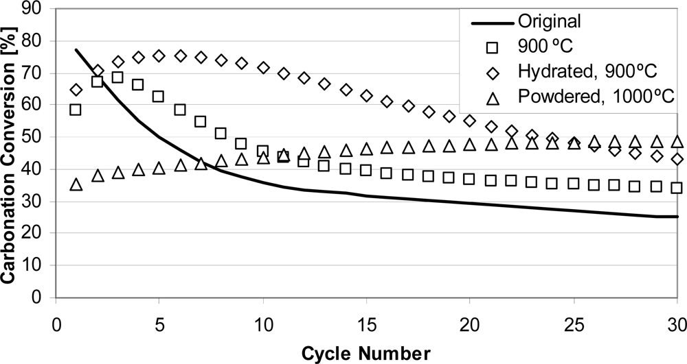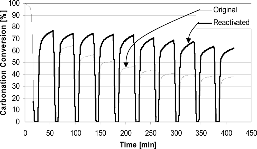 The improvement of sorbent activity for extended use is imperative because sorbent replacement costs strongly influence the overall cost of CO2 capture [14]. Reactivation by hydration currently appears to be a promising method for recovery of the sorbent activity [15,23,24]. Another approach is thermal pretreatment of the sorbent at high temperatures [25–27]. Here, thermal pretreatment typically causes lower conversions during the early cycles, but conversions in later cycles are higher than those for the original, untreated sorbents. This phenomenon of increasing conversion with an increasing number of reaction cycles has been called self-reactivation [26].