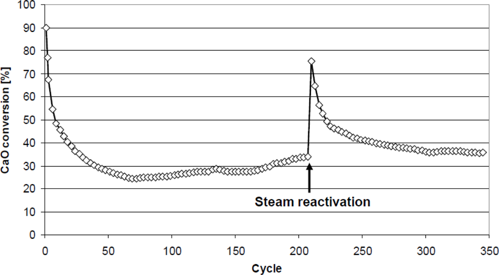 - In the steam reactivation tests, limestone samples were subjected to calcination/carbonation cycles and reactivated in a pressurized steam reactor [15].