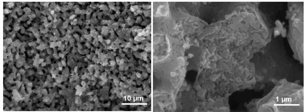 The morphology of pellets was observed by a SEM and obtained images at magnifications of 2,500× and 20,000× are presented in Figure 8. The images were taken from the interior of broken pellet spheres after 30 CO2 cycles. It can be seen that two types of pores are present: large macropores on the 1 μm scale and mesopores on the 10–100 nm scale. These nano-sized pores, which did not disappear during cycles, are responsible for carbonation conversion because they are the main contributor to the sorbent surface area and to the micro- and meso- porosity necessary for storage of more voluminous product, CaCO3.