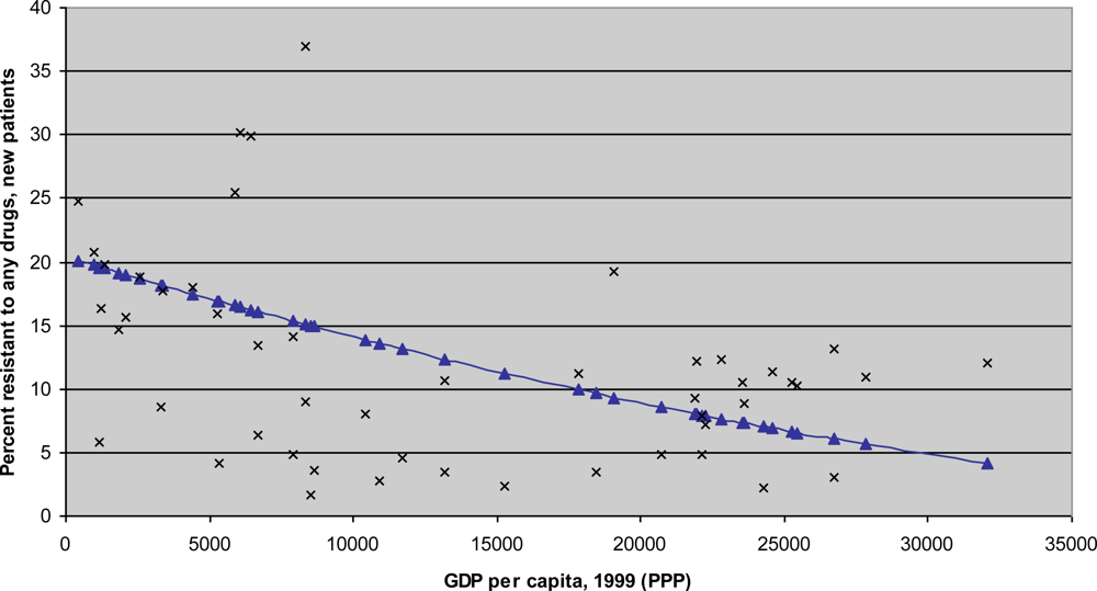Figure 1 illustrates the high resistance rates to anti-Tuberculosis drugs in areas with low per capita resources. (By contrast, high-income countries like the US have among the world’s highest rates of resistance to second- and third-line drugs, such as vancomycin among antibiotics [