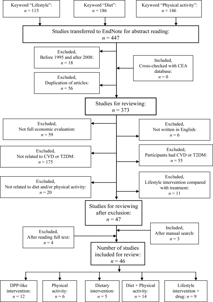 This is the first study, to our knowledge, to include dietary and physical activity lifestyle interventions that affect T2DM and/or CVDs, with a special focus on DPP-type interventions. A recent study by Anderson [