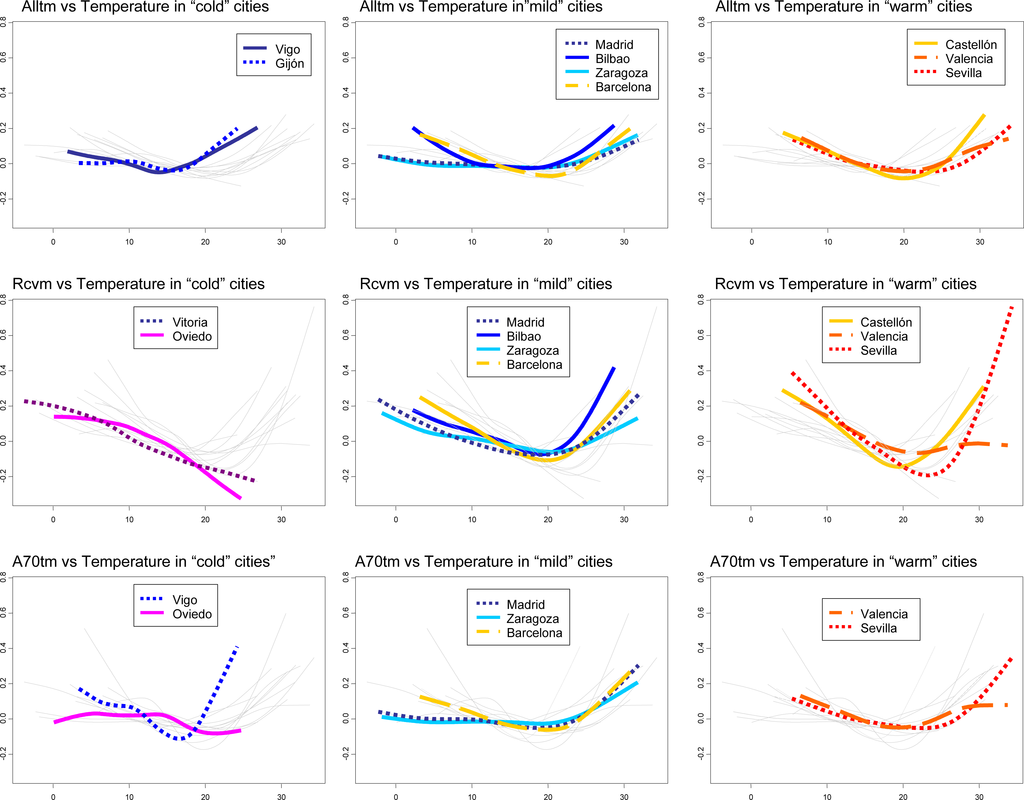Curves of significant associations between temperature and mortality for: total mortality (Alltm) in the first row, cardio-respiratory mortality (Rcvm) in the second row, and mortality among people 70 years old or over (A70tm) in the third. Cities are grouped according to their mean temperature into “cold” cities (Vitoria, Oviedo, Vigo, Gijon), “mild” cities (Madrid, Bilbao, Zaragoza, Barcelona) and “warm” cities (Castellón, Valencia, Huelva, Seville, Cartagena). The rest of the curves are drawn in light gray.