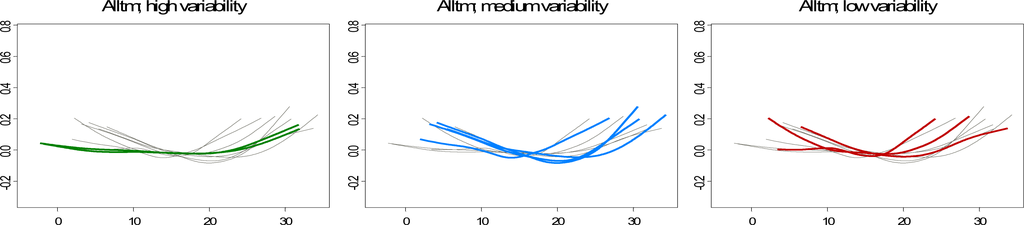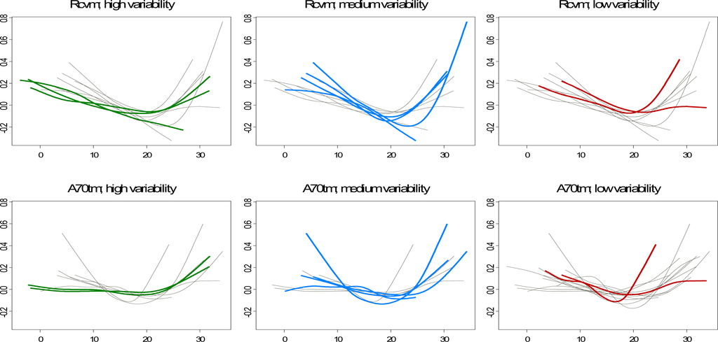 Curves of significant associations between temperature and mortality for: total mortality (Alltm) in the first row, cardio-respiratory mortality (Rcvm) in the second row, and mortality among people 70 years old or over (A70tm) in the third. Cities are grouped according to their Coefficient of Variation into “high variability” (Vitoria, Madrid, Zaragoza), “medium variability” (Oviedo, Vigo, Barcelona, Castellón, Seville) and “low variability” cities (Gijon, Bilbao, Valencia, Huelva, Cartagena). The rest of the curves are drawn in light gray.