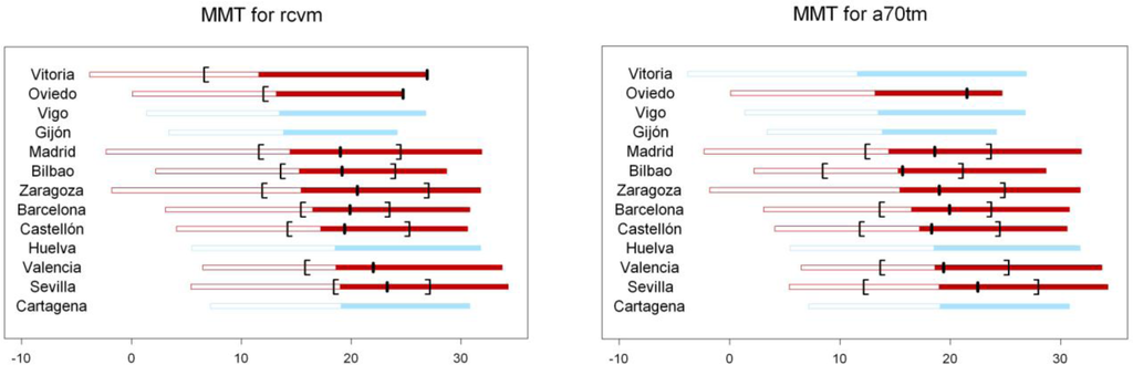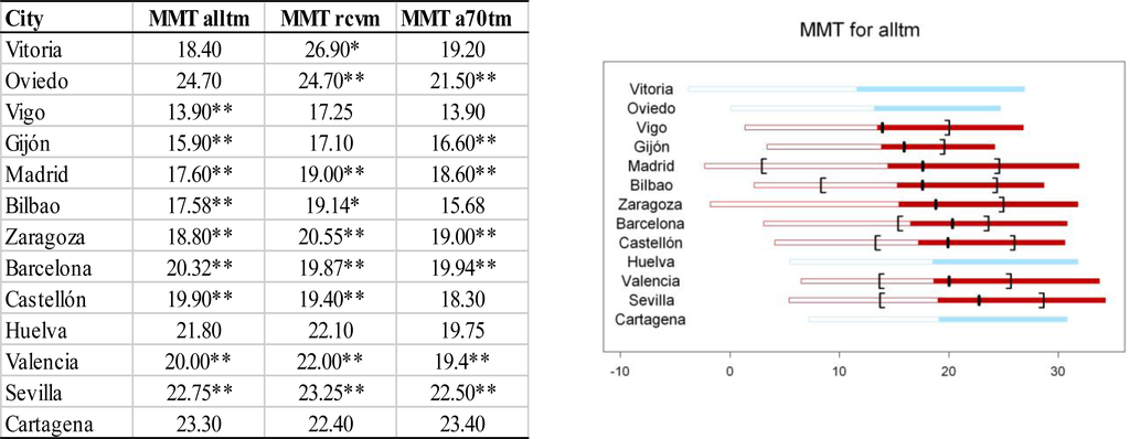 This table includes the temperature associated with minimum mortality (MMT) in each city for total mortality (alltm), mortality due to cardio-respiratory causes (rcvm) and mortality among people 70 years old or over (a70tm). The graphs show: MMT (black segment), the temperature range where the predicted mortality is not statistically different from the minimum mortality (black brackets) and the mean temperature of each city (change from empty to solid box). Red is used for significant associations and blue for non-significant associations.(*) indicates 10% statistically significant associations; (**) indicates 5% statistically significant associations.