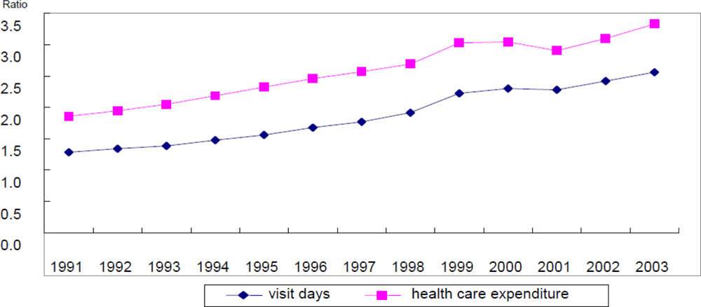 As the proportion of older population increases, their health care expenditures tend to increase accordingly, where the health care expenditure represents those accrued in the national health insurance that includes doctors’ service charges and operating expenses, but excludes expenditures for drugs and supplies. The ratio of the health care expenditure of person over 65 to that of person under 65 during the period between 1991 and 2003 is shown in Figure 1.