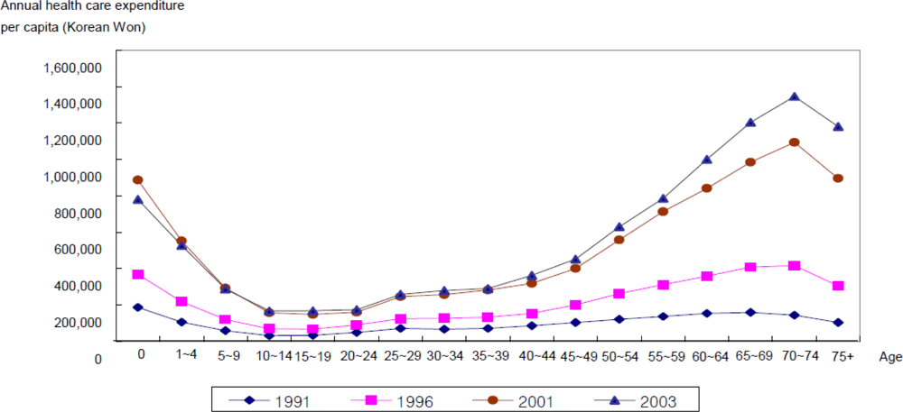 The age-expenditure profile approach is limited by its need for health care expenditure data, according to age groups. Therefore, this paper uses the data produced from the National Health Insurance (NHI) in Korea. The annual health care expenditures per capita, by age cohort, were calculated, and thus those constituted the health care expenditure structure with age cohort. This enables us to observe how health care expenditures have changed in accordance to the age structure shifts. We measured the profiles for the years 1991, 1996, 2001, and in addition, measured a profile for 2003. Visiting days, which sum up the annual hospitalized and outpatient days by age cohort, measure the changes in service utilization by age cohort. However, when the health care expenditures by age cohort also include the price changes for services for each corresponding year, it is difficult to separate the effects of aging. Therefore, to observe the health care expenditure in accordance with the genuine change in age structure, it is necessary to find some way of standardization. The method used for this purpose is to calculate the relative indices of health care expenditure by age cohort and observe the structural changes by year. The volume of services used by patients of each age cohort can also be calculated using this method.