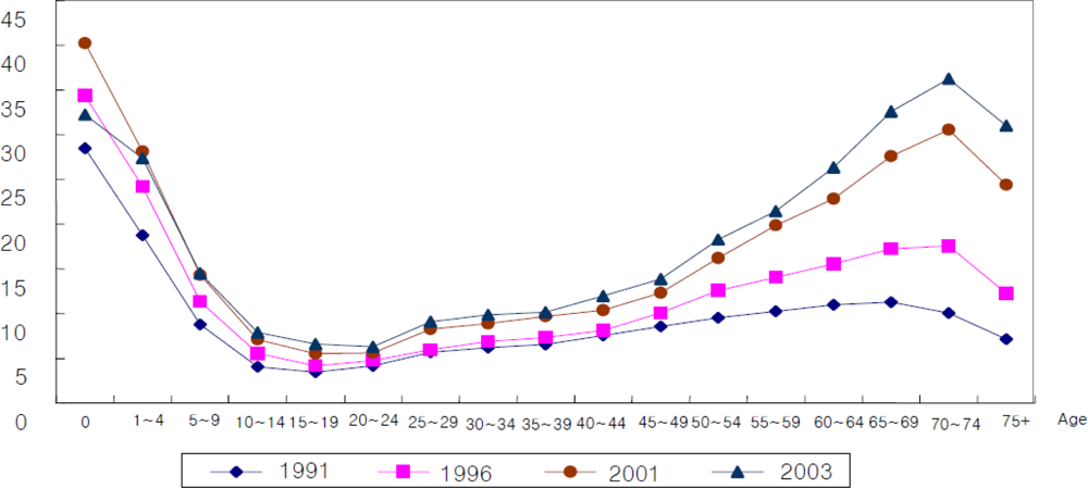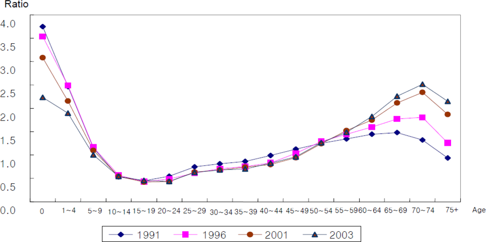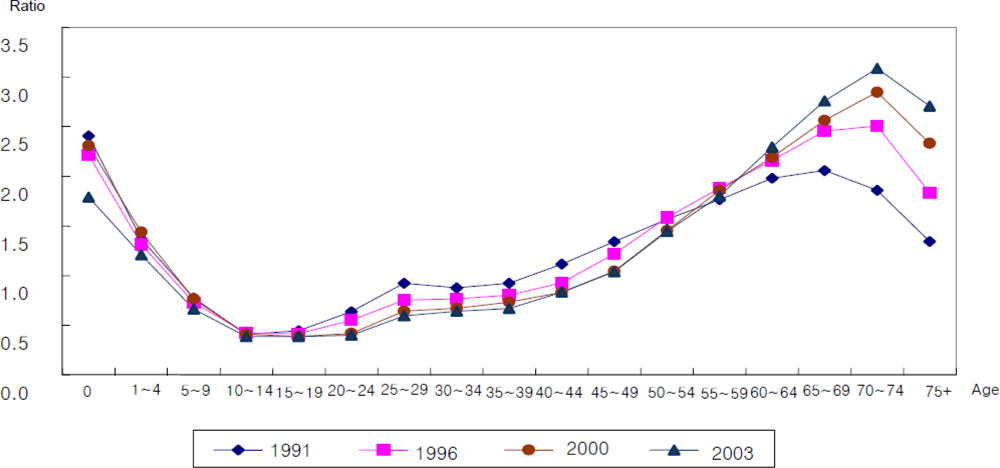 To correct the problem that occurs when comparing with current prices of each year, the relative magnitude of health care expenditures by ages in each year is calculated, as shown in Figure 3. Compared to the health care expenditures of 1991, those of 2003 were relatively higher for older persons and relatively lower for younger persons. Especially for youth and middle-aged people, health care expenditures were relatively low. This shows that as the data moves closer to the present, the health care expenditures for older patients are increasing. This implies also that health care resources distributed for older people are increasing. So to extend the lives of those who are older, the structure of health care resources allocation is undergoing changes.