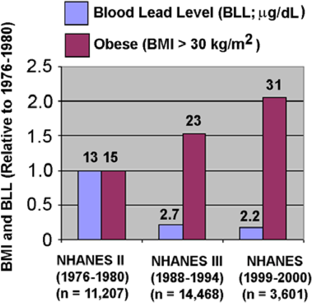 It is possible that the negative association between obesity and blood lead levels is misleading. There is a positive association between creatinine levels and obesity, and several studies have shown that body lead levels are proportional to creatinine levels because, as mentioned above, lead positively associates with kidney dysfunction and this prevents proper filtration of creatinine, which is produced from creatine kinase breakdown in muscles from the blood [,,]. Also, a recent study has shown that recent severe weight loss can cause the release of stored lead from bones [], and the weight history of the NHANES sample is not completely known. However, as shown in Figure 1, there has been a steady decrease in blood lead levels from 1977 to 2000 at the same time that there has been a steady increase in obesity in the NHANES populations. This result is consistent with lead being negatively associated with obesity. We note that Figure 1 is based on NHANES population studies, which are cross-sectional in that both metals and outcomes are assessed at the same time. Further prospective studies are needed to address the temporality of these findings.