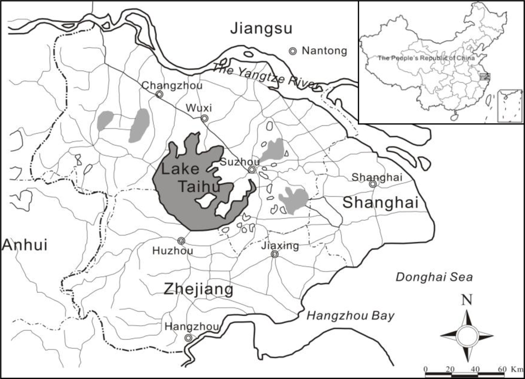 Lake Taihu is located in eastern China between 30° 55′ 40″ N and 31° 32′ 58″ N, and 119° 52′ 32″ E and 120° 36′ 10″ E. It is the third largest freshwater lake in China, with a total water area of about 2,338.11 km2. It is a shallow lake, with mean depth 1.9 m, and maximum depth 2.6 m at a water surface elevation of 3.0 m above sea level. The Lake Taihu drainage basin (Figure 1) is the most industrialized area in China with high population density and urbanization. Lake Taihu is important for water supply, flood control, tourism and recreation, shipping and aquaculture. With the increasing pollution from both urban and rural areas surrounding the Lake Taihu Basin over the past two decades, eutrophication and algal blooms (Microcystis spp.) have occurred frequently, which badly affects the function of the lake as a drinking water supply. More efficient water quality monitoring of the lake is urgently needed [13].