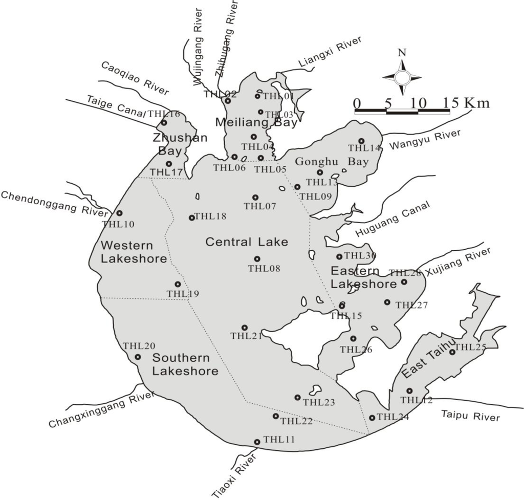 Distribution of the 28 sampling sites in Lake Taihu (THL01–28).