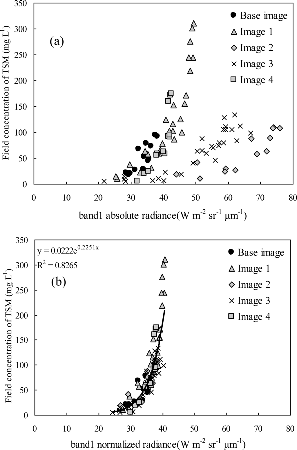 Figure 3 shows the relationship between TSM concentrations and band 1 radiance before and after the atmospheric correction, from which we can see that after the atmospheric correction the other images (images 1–4) corrected to the scale of the base image (January 2005).