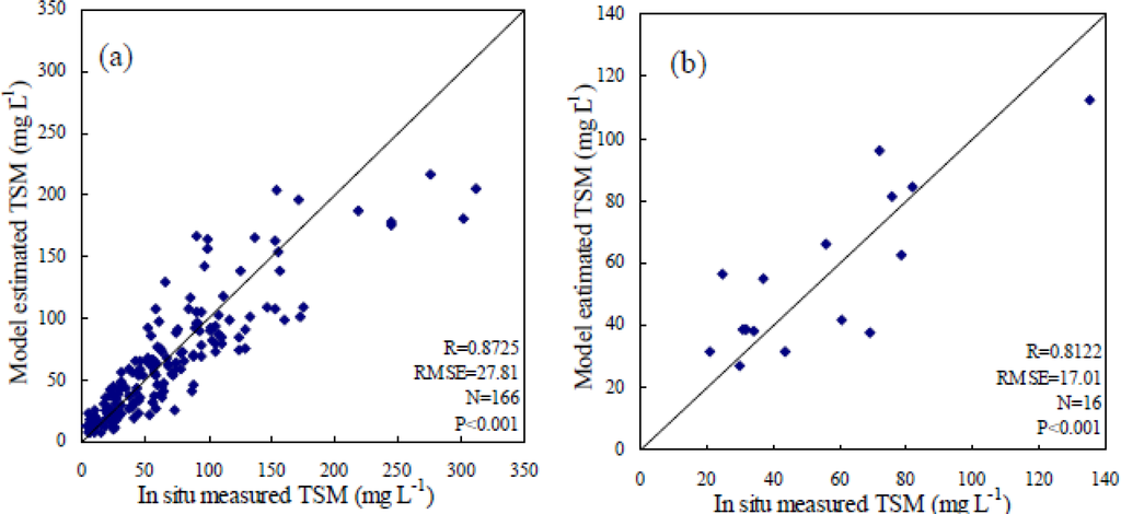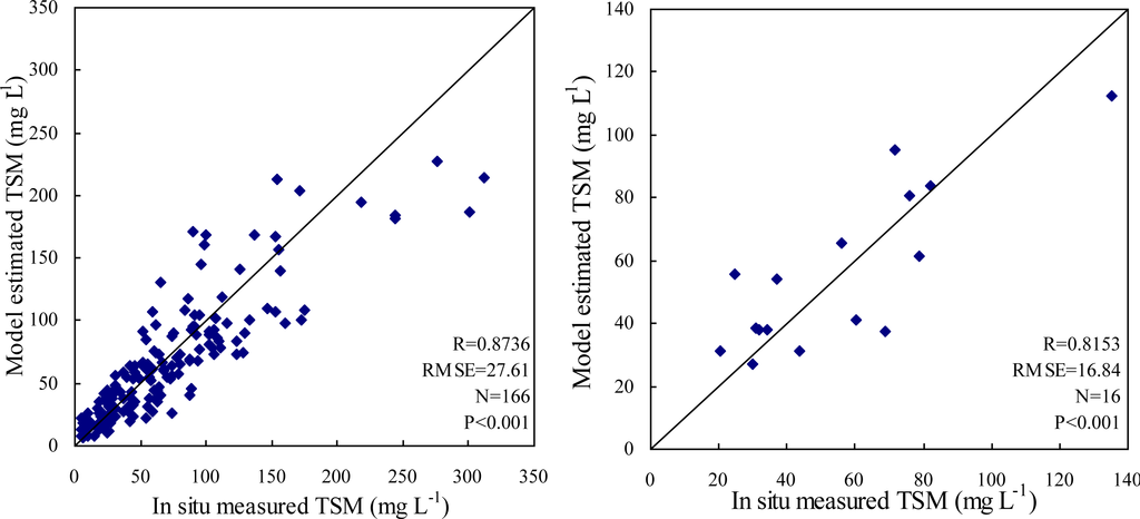 As shown in Figure 5, the model-estimated TSM was significantly related to the in situ measured TSM both in the model calibration and model validation phases, indicating that the empirical retrieval model developed in this study could map TSM concentrations relatively successfully. However, an underestimation also occurred, particularly when measured TSM concentrations were higher than 200 mg L−1 because of spectrum saturation effect (see Figure 4). Higher root mean square error (RMSE) of the estimated TSM may be caused by the following reasons: (1) water samples were collected from a fixed point while MODIS images give average radiance value over grid of 250 × 250 m; (2) time lag between field sampling and satellite overflight; (3) radiance value is influenced by adjacent pixels; (4) uncertainty of atmospheric correction; (5) the inherent error term in the statistical regression model.