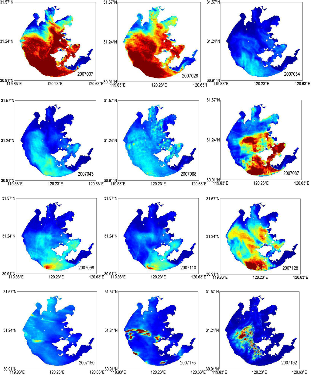Distribution of TSM concentration (mg L−1) from January to December, 2007 in Lake Taihu from MODIS images.