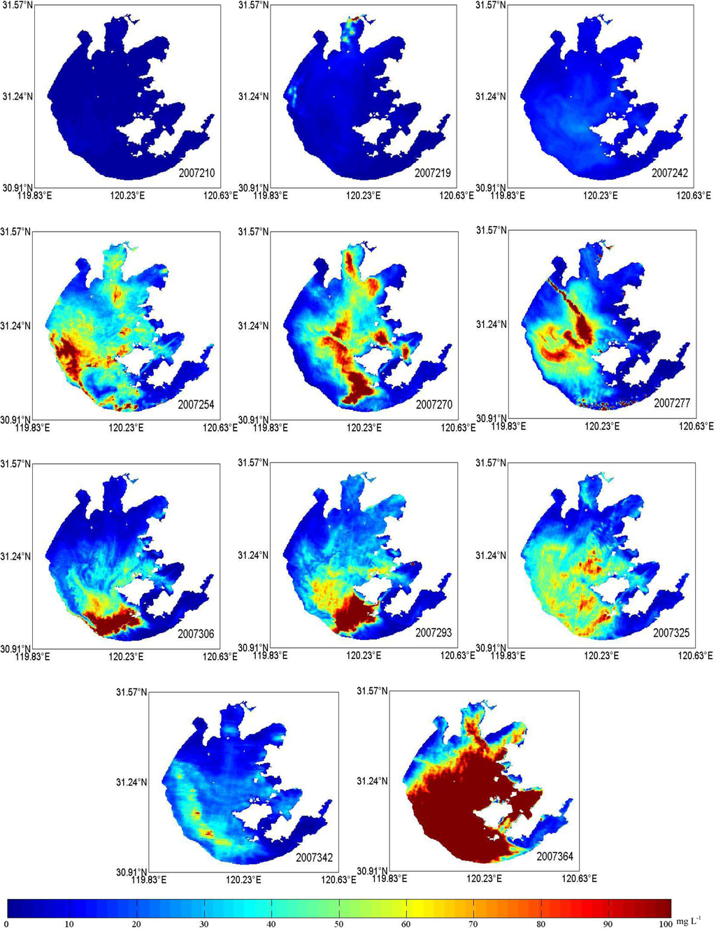 Finally, the synoptic maps of TSM concentrations in 2007 were obtained (see Figure 6), which represent the distribution and variation of TSM concentrations in both temporal and spatial scales.