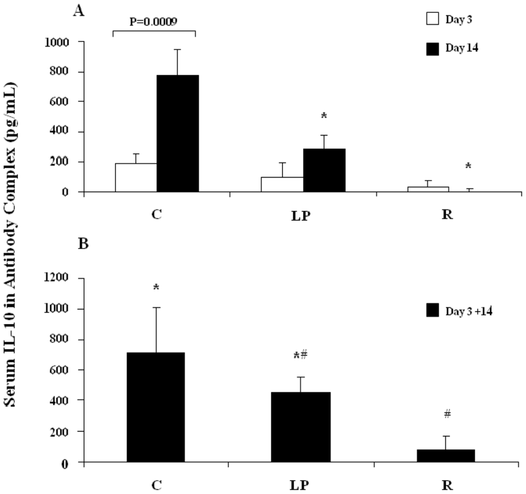 As shown in Figure 1A, a two-way ANOVA (pooled SEM = 0.80) revealed main effects of diet (P = 0.0001) and stage of weight loss (P = 0.012) together with a statistically significant interaction term (diet X stage, P = 0.025). Bars represent mean values (squared means of square root transformed data) and an SEM is shown for each mean. According to Least Squares Means analysis a lower response to LPS was apparent in both malnourished groups (LP: low-protein group; R: restricted-intake group) relative to age-matched controls (group C) when weight loss was in its advanced stages, i.e., at day 14 (P ≤ 0.05, bars marked with an asterisk). In fact, an LPS response was undetectable in the restricted-intake group at this stage. By contrast, no difference was apparent between either of the malnourished groups and the age-matched control group at the early stage of weight loss (day 3). Moreover, comparison between the age-matched control groups (day 3 vs. day 14) confirmed the ontogeny-associated rise in IL-10 production in response to LPS stimulation (P = 0.0009, Least Squares Means). Thus, the normal ontogenetic rise in LPS-stimulated IL-10 production was attenuated as malnutrition progressed in both forms of wasting pathology.