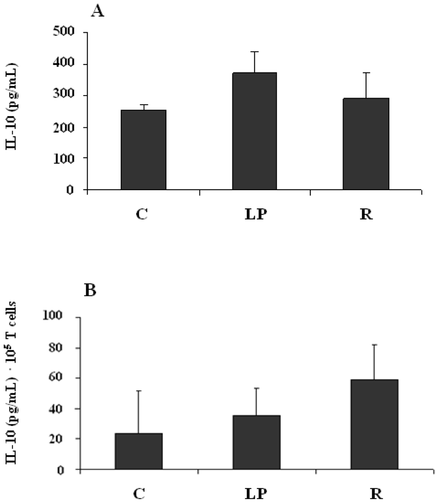 Figure 2A presents the outcome of a one-way ANOVA which revealed no diet-related effect on the production of IL-10 by splenic and nodal mononuclear cells in response to LPS in vitro (P = 0.47; pooled SEM = 36.1). Each bar represents a mean value (C: age-matched control group; LP: low-protein group; R: restricted-intake group) and is accompanied by its corresponding SEM.