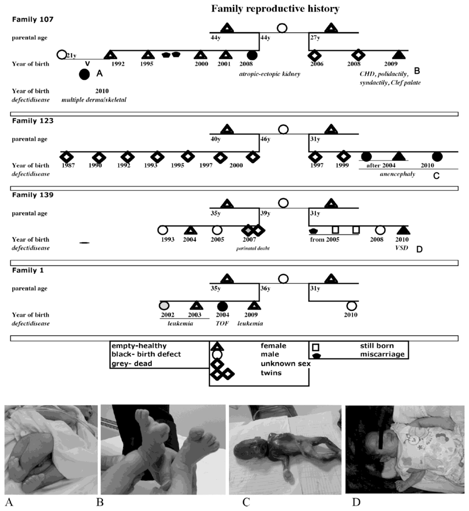 Top panel-family reproductive history is graphically represented. Bottom panel-Photographic record of birth defects: (A) Male child diagnosed with very short webbed neck, rocker bottom feet, malformed thighs, and legs flexed at hips, knees and ankles, retracted penile skin-born full term, August 7, 2010—Family 107—daughter progeny. (B) Female child diagnosed with cleft palate, poly and sindactily of both feet and right hand and congenital heart defect-born at 42 weeks, October 1, 2009—Family 107. (C) Induced abortion (at 22 weeks) of a male fetus with anencephaly, May 31, 2010. (D) Female child, with ventricular septal defect (VDS), born at full term, April 28, 2010—Family 139. Patient consent for publication of the data was obtained from all concerned.
