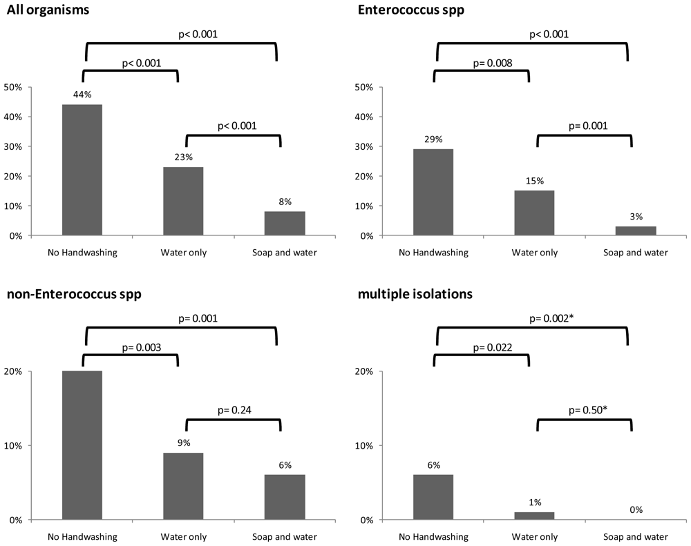 Table 1 shows the different organisms isolated in the three study arms. Enterococcus spp. were the most common bacteria found, followed by Enterobacter spp. Figure 1 shows the effect of handwashing with soap or water only on contamination, compared to no handwashing. Overall, handwashing with water alone reduced the prevalence of bacteria substantially. Handwashing with soap was more effective in reducing the prevalence of contamination and specifically of Enterococcus spp. There was a trend that handwashing with soap was also more effective in reducing the prevalence of other species and of multiple isolates, but the statistical support was low (Figure 1).