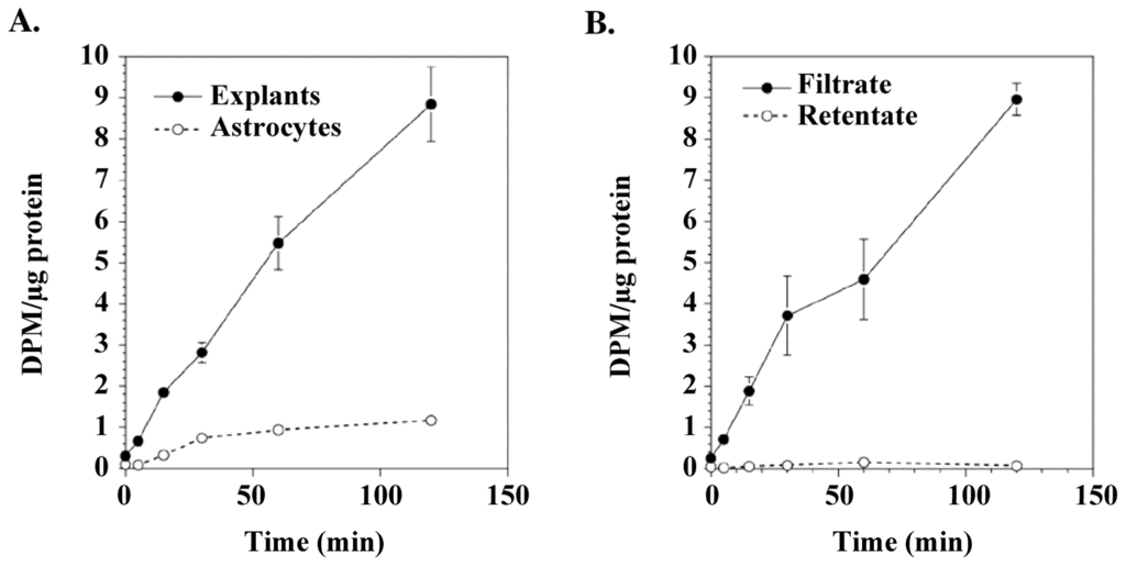 L-BMAA might exert a chronic neurotoxic effect by being incorporated into protein, the foreign amino acid residue causing protein malfunction. The basis for this hypothesis comes from experimental evidence of significant levels of protein-associated L-BMAA in washed cycad flour and the detection of L-BMAA in the brain tissue of Guam Chamorros with ALS-PDC [38,39]. In support of this hypothesis, we showed that L-BMAA, but not l-BOAA, is taken up by cortical explants and synaptosomes in a time-dependent manner [40]. Previously unpublished data confirmed tissue uptake of L-BMAA in cortical explants treated with [14C]-L-BMAA and in mouse cortical synaptosomes treated with [3H]-L-BMAA (Figure 4). Additional data (not shown) demonstrated that L-BMAA is taken up and released from cortical synaptosomes. The rapid uptake, accumulation and release of L-BMAA, but not the structural analog L-BOAA, in cortical explants and synaptosomes suggest that the sub-chronic neurotoxic effects of this excitotoxin in primates is related to unknown intracellular actions.