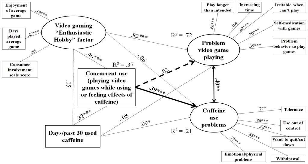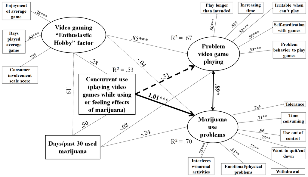 For main hypothesis tests, structural equation models were run in MPlus 6.0, separately by substance. In each model, PVP and substance use problems were continuous latent variables measured by their observed components and allowed to correlate. MPlus is capable of creating a continuous latent variable from binary observed indicators, and this was done for the five indicators of caffeine use problems and the seven indicators of each of marijuana and alcohol use problems. PVP and substance use problems were regressed over the concurrent use binary variable, the observed indicator of substance use frequency, and a latent indicator of video gaming as an enthusiastic hobby. In a separate statement, concurrent use was regressed over substance use frequency and the latent variable for video gaming as an enthusiastic hobby. Substance use frequency and the latent variable for video gaming as an enthusiastic hobby were allowed to correlate. The latent variable of video gaming as an enthusiastic hobby was measured by the observed indicators of game enjoyment, hours played, and the scale score for consumer involvement. In the last statement specifying the model, all of these variables were regressed over demographic variables, so that the structural models described below refer to effects after demographic controls. The binary variable for concurrent use was accommodated in a mediating role through theta parameterization, and post-stratification weights were accommodated using means and variance adjusted weighted least squares (WLSMV) estimation.