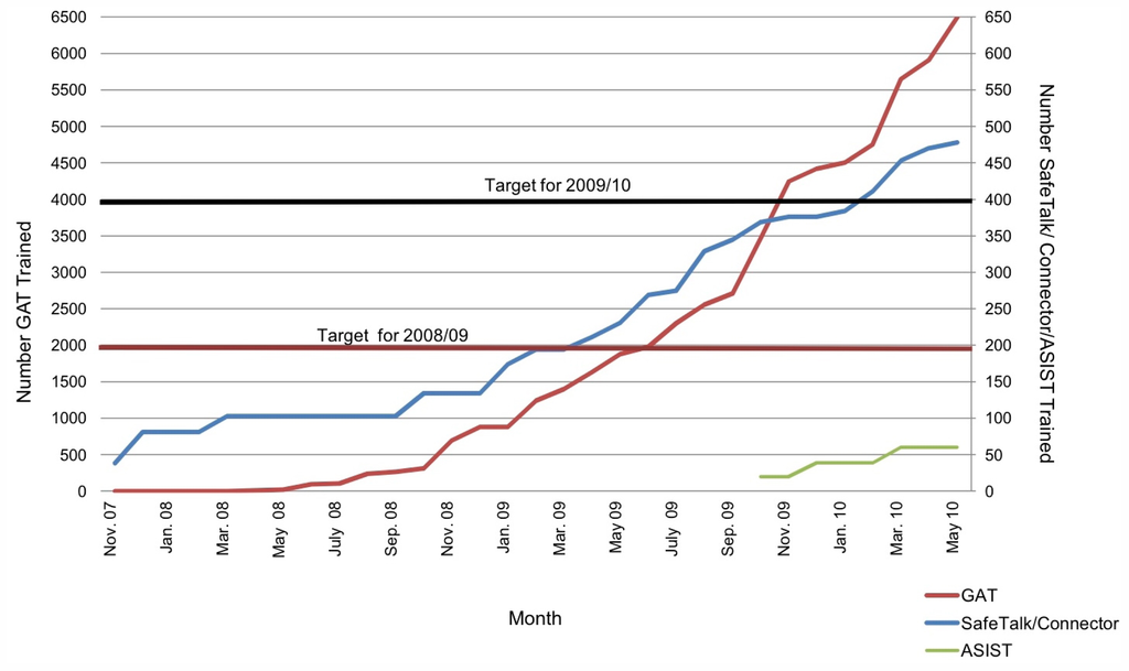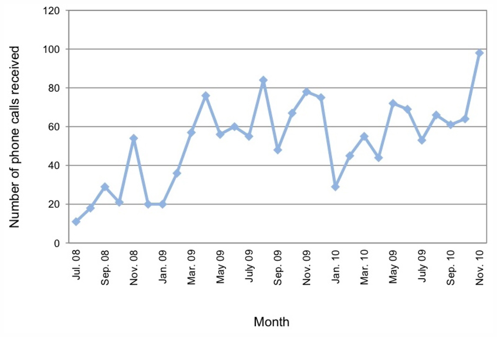 The MIC emergency help-line received 1521 after-hours calls between July 2008 and November 2010, with patterns of usage over time indicated in Figure 3. We note this excludes calls responded to by MIC staff during business hours, which is not available. Additionally, 328 (4%) GAT participants requested a follow-up phone call from a Field Officer by indicating this on the evaluation form following the training.