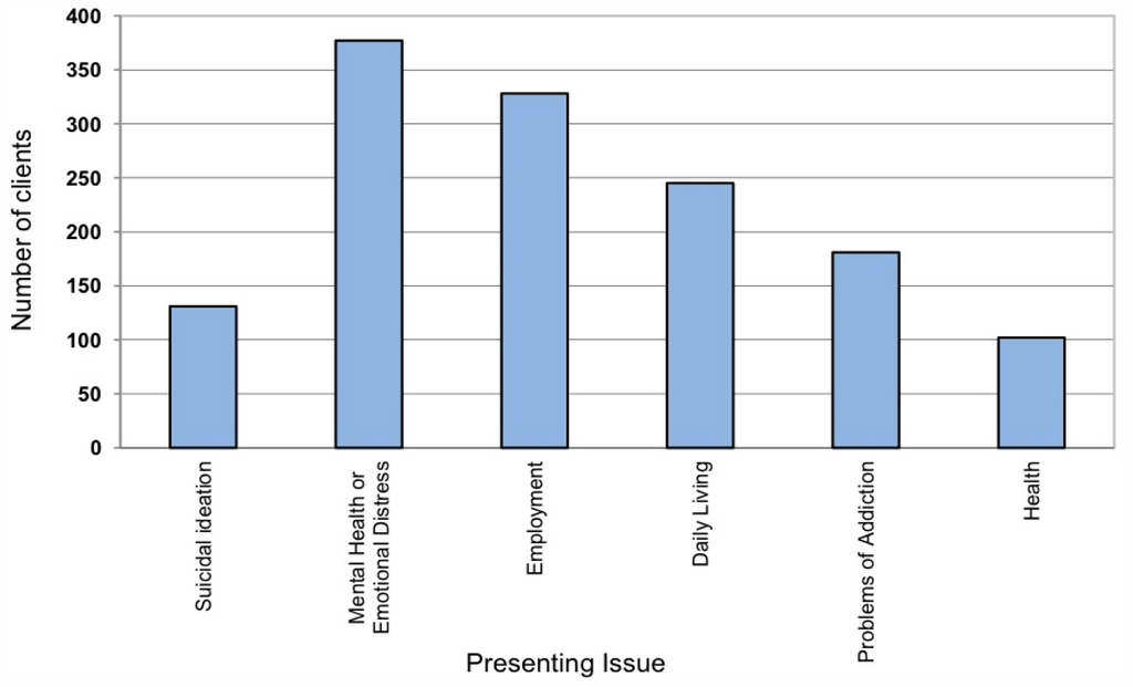 As depicted in Figure 4, case management clients sought assistance from MIC for a variety of issues, with many presenting multiple areas of concern. Active suicidal ideation was reported by 101 referred clients, with 30 clients requiring suicide intervention. Case management clients were eventually referred to any of a variety of specialist services, depending on the nature of the presenting difficulties. Forty-one percent of case management clients were referred to Converge International (n = 274), an employee-assistance counselling organisation contracted to provide services to MIC clients. Liaison or referral also occurred with unions, financial services, various Government Departments, medical services, and legal professionals.
