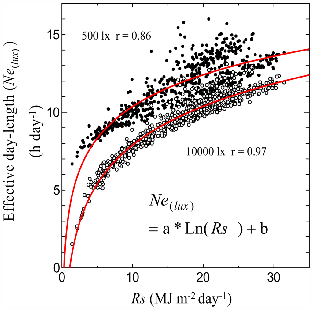 Figure 1 shows the relationships between the monthly average of Ne(500) (h day−1) and the monthly average of Rs (MJ m−2 day−1) and between the monthly average of Ne(10000) and monthly average of Rs. At low light intensity (500 lx), the relationships were not clear. At low light intensity, the Ne(lux) values were almost the same as the monthly averages of N0 (h day−1). This means effective day length at low light intensities will be free of the influence of any weather conditions. At high light intensity (10,000 lx), the relationships between Ne(lux) and Rs were clear and a logarithmic curve was well fitted.